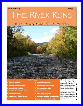 Our fall issue of The River Runs is now available. This month, we feature a note from board president Dick Brooks, a recap of our annual summer picnic by Executive Assistant Lynne Griffith and more. Meet our incoming board members and learn about our upcoming Griffith Knob ascent and Walton Tract cleanup. Dick Brooks provides an Atlantic Coast Pipeline update along with a brief ancedote about rabies on the Cowpasture River. Rambunctious brothers John and Jim DeVenny share some special memories and we pay tribute to our departing board members.